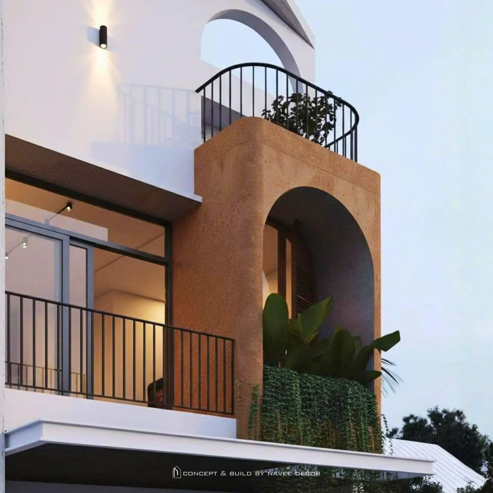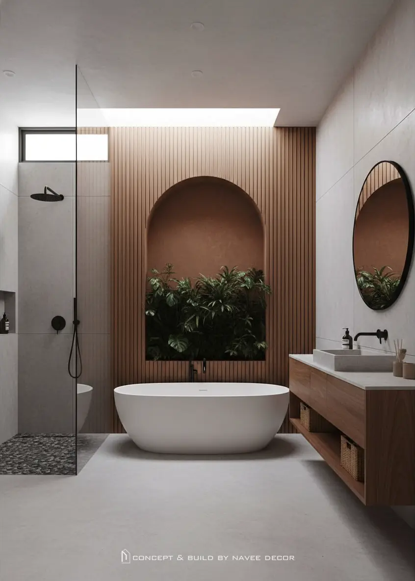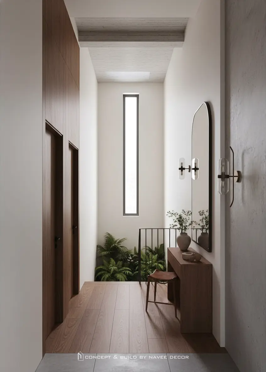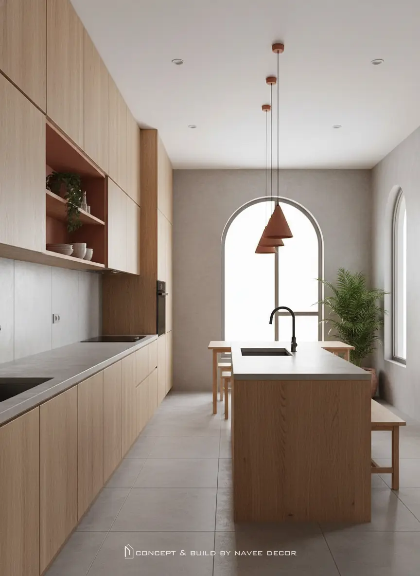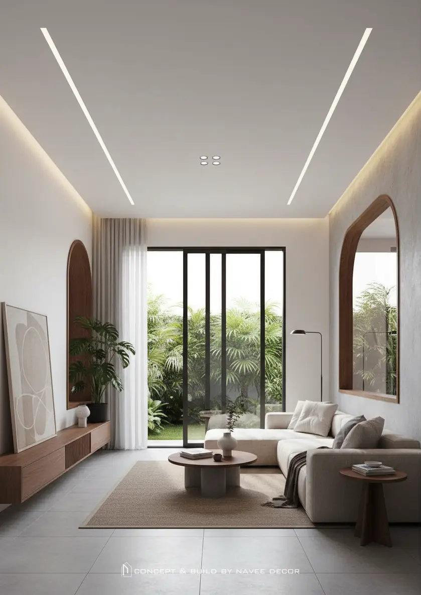 Trong concept nhà phố này, Navee Decor lựa chọn ngôn ngữ thiết kế tối giản kết hợp vật liệu gỗ tự nhiên và gam màu trung tính. Hình khối kiến trúc mềm mại với những đường cong nhẹ, khoảng mở đón ánh sáng và không gian xanh lồng ghép tinh tế, tạo nên cảm giác thư thái ngay khi bước vào.