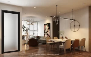 Ngôn ngữ thiết kế tập trung vào sự cân bằng giữa vật liệu, ánh sáng và tỷ lệ không gian. Gam màu trung tính kết hợp sàn gỗ tự nhiên mang lại cảm giác ấm áp, trong khi hệ tủ và các mảng ốp gỗ được xử lý tinh gọn giúp tổng thể nội thất hiện đại nhưng không lạnh lẽo, đồng thời tận dụng hiệu quả diện tích căn hộ.