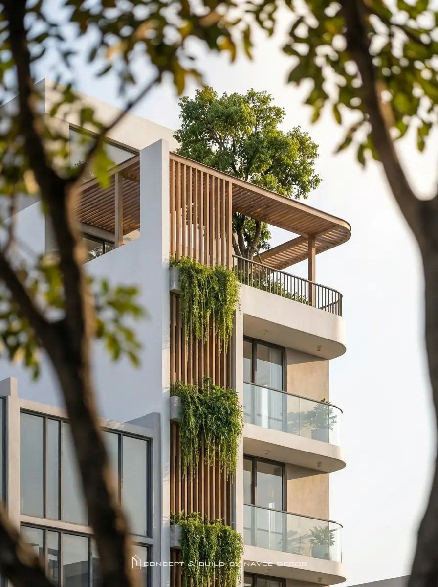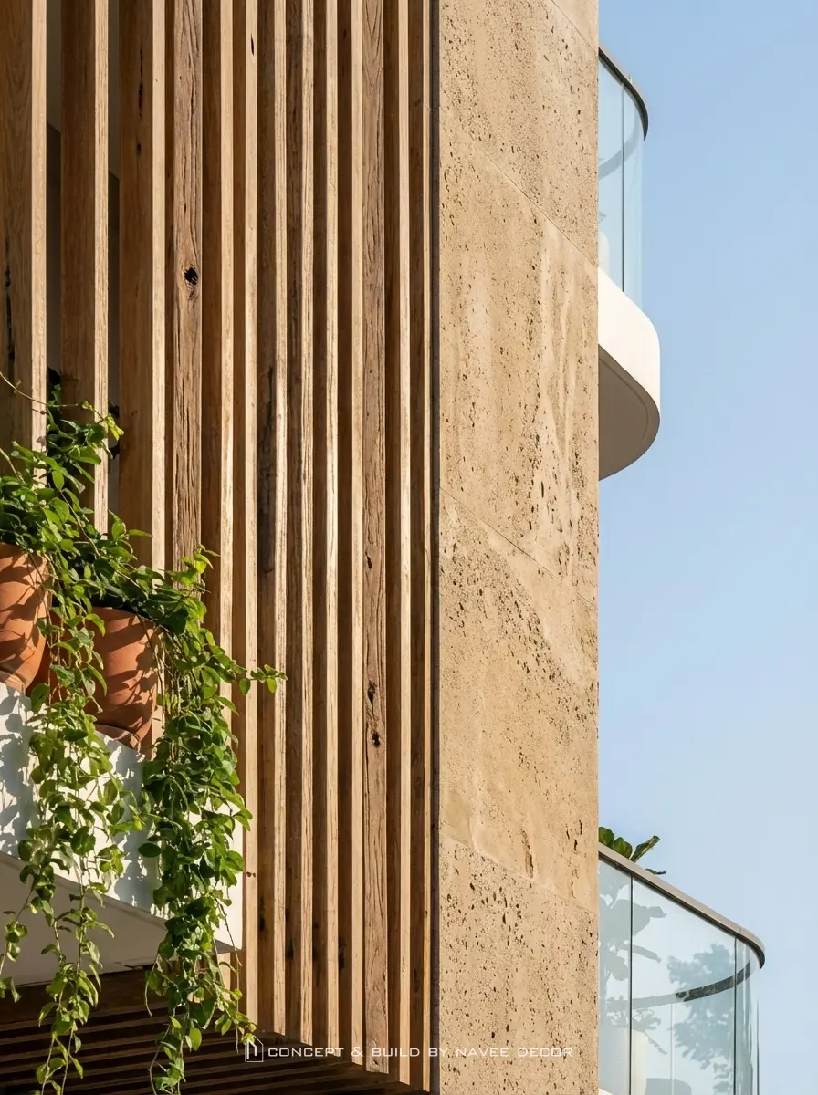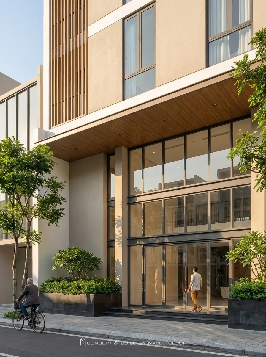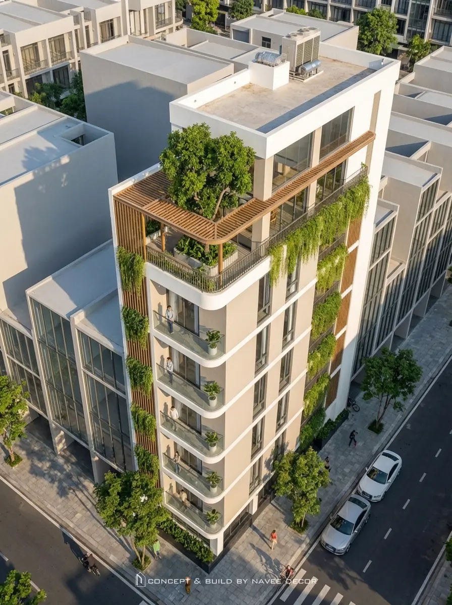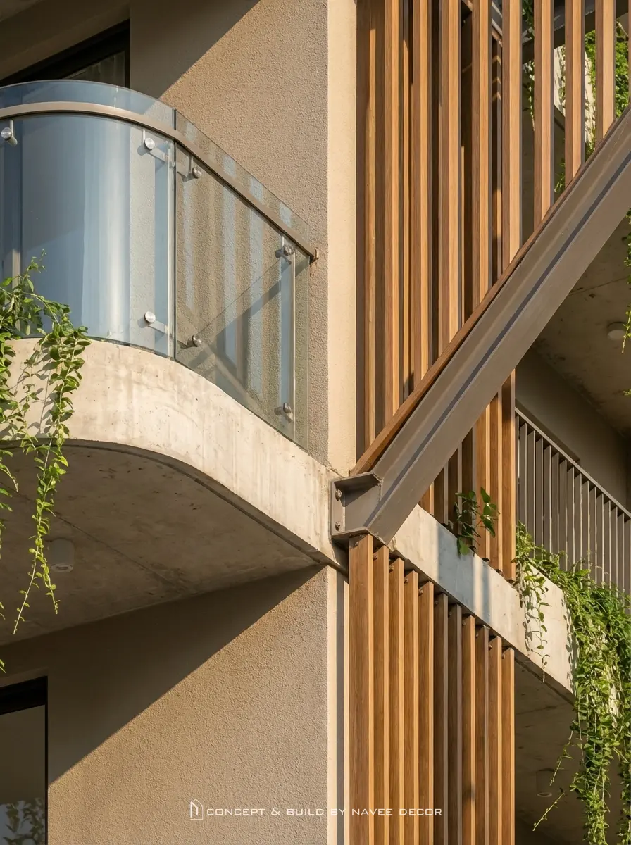 - Hệ lam gỗ chạy dọc kết hợp cây xanh rủ tầng: giảm bức xạ nhiệt, tăng thẩm mỹ.