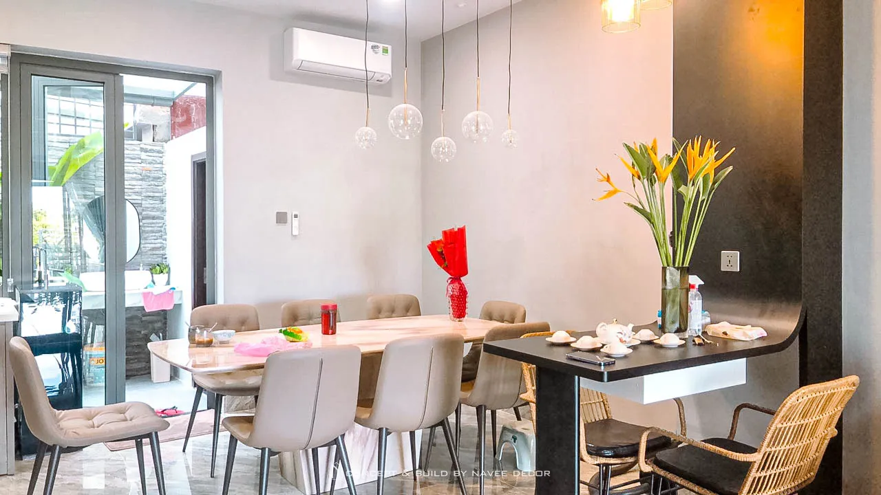 - Thiết kế bếp chữ L kết hợp đảo nhẹ, đảm bảo tam giác công năng và thẩm mỹ. Ánh sáng thả trang trí tạo điểm nhấn ấm cúng cho khu vực ăn uống.