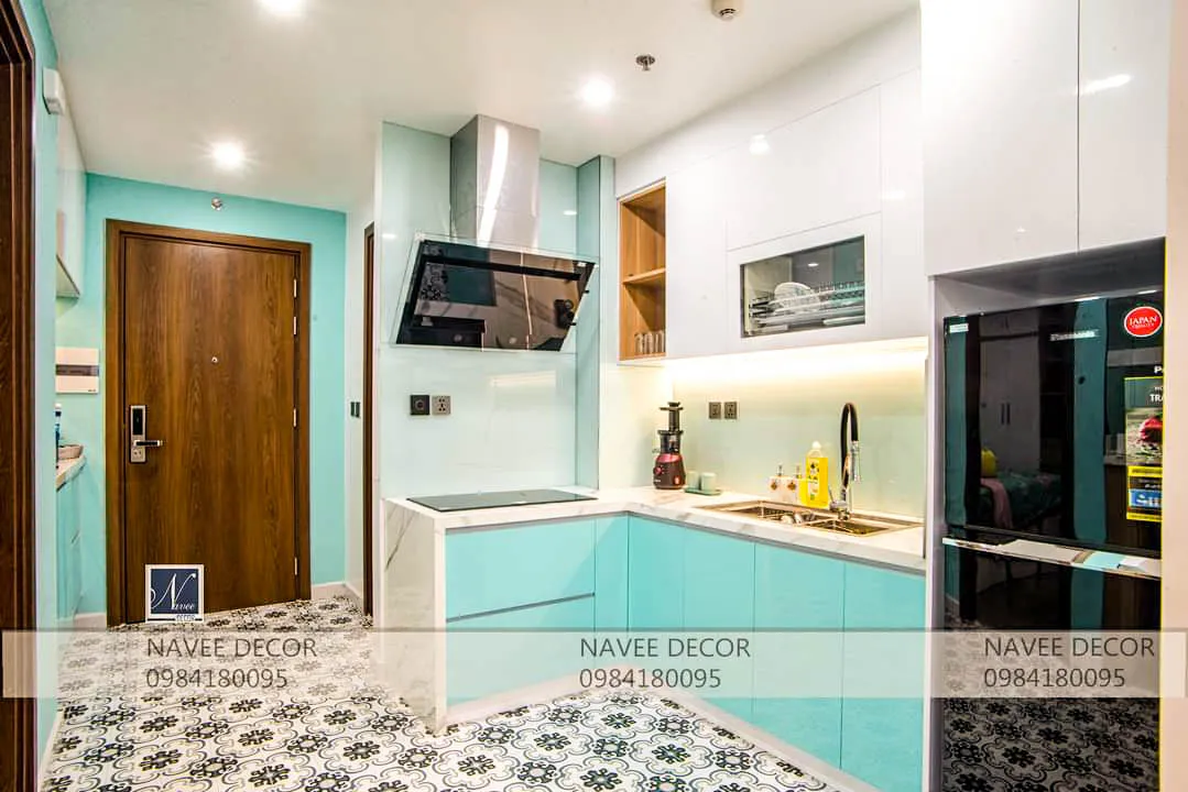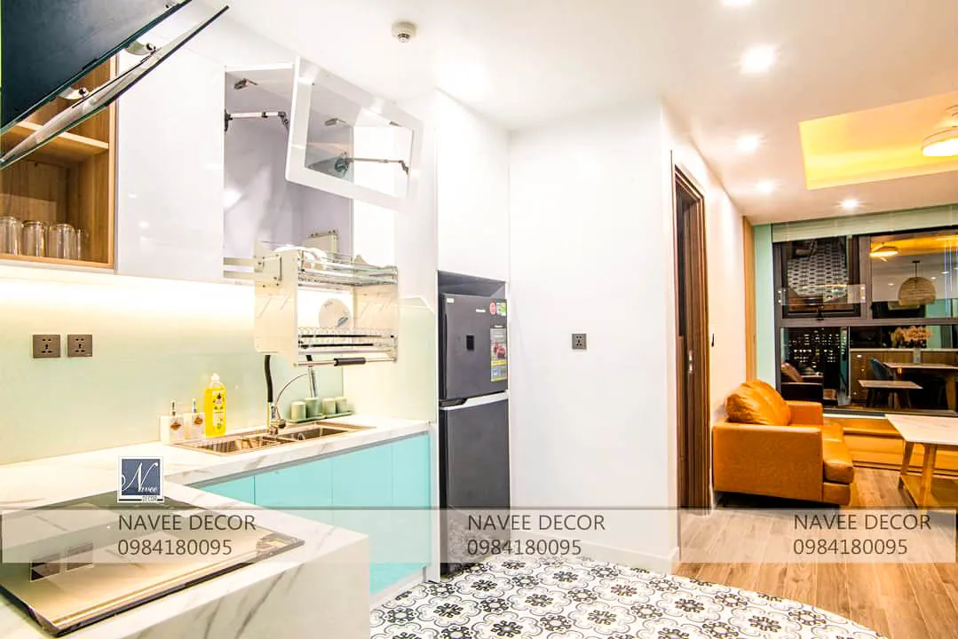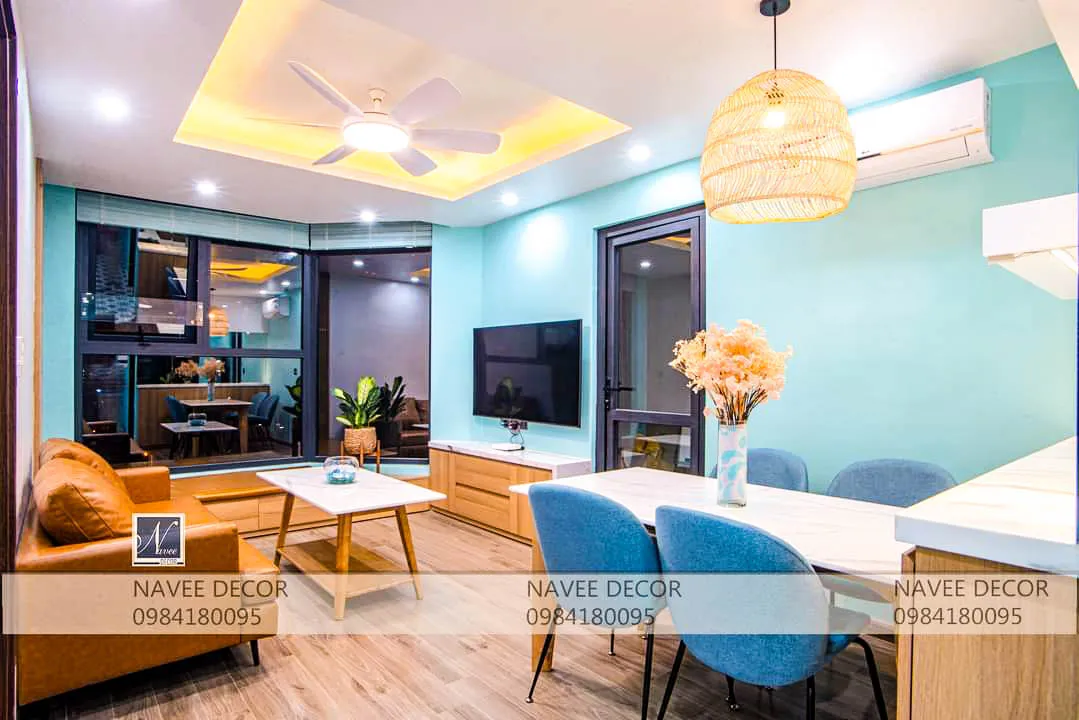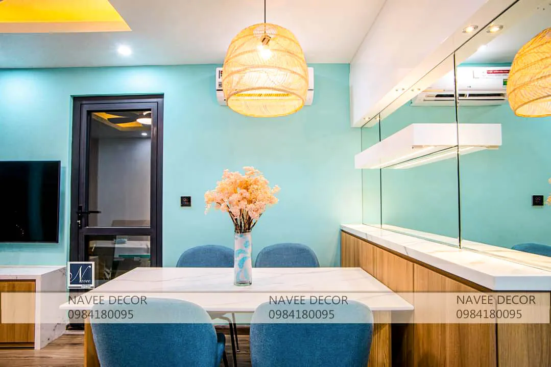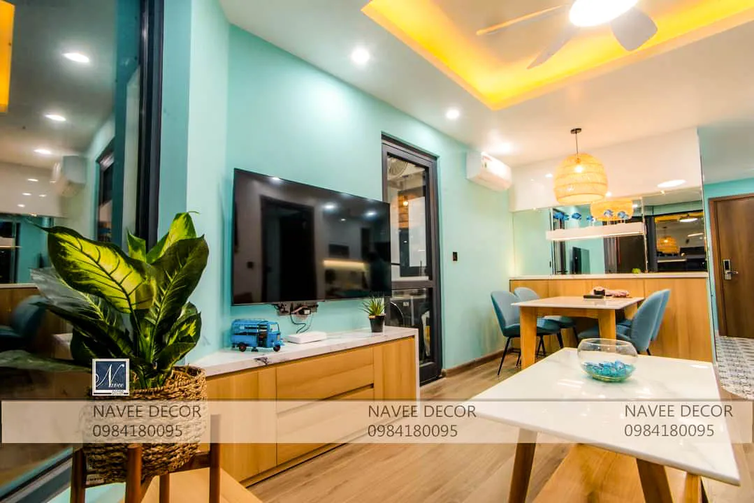 Với đặc thù căn hộ diện tích vừa phải, bài toán đặt ra không chỉ là đẹp mà còn phải tối ưu công năng. Thiết kế không gian mở liên kết phòng khách – bếp – bàn ăn, giúp tăng chiều sâu thị giác, sử dụng tone màu xanh mint chủ đạo mang lại cảm giác tươi mới, kết hợp cùng gỗ sáng màu và ánh sáng vàng ấm cân bằng giữa hiện đại và ấm cúng.
