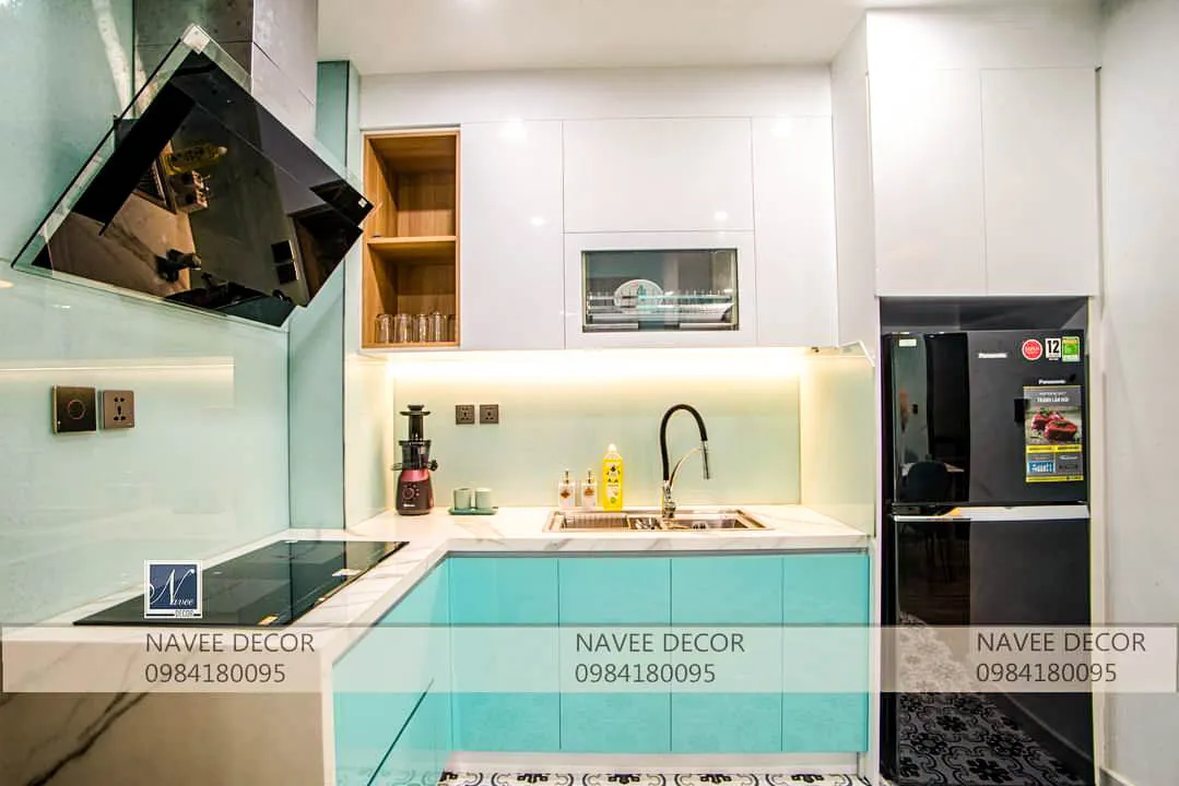 - Kết hợp kính ốp bếp sáng màu giúp không gian luôn sạch sẽ, dễ vệ sinh